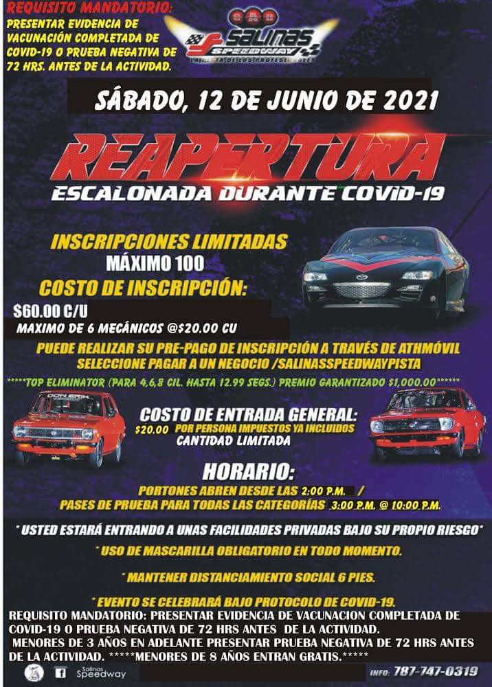 Por fin se nos dio Fiebrus. La apertura escalonada de Salinas Speedway ya es un hecho. Ya salinas anuncia 3 fechas abiertas al publico. Aunque con un capacidad limitada por el gobierno de Puerto Rico. Las fechas de apertura escalonada lo son el 12 de junio, 19 de Junio y 26 de junio donde se llevara a cabo un Rotores vs Pistones. Aquí le adjuntamos los flyer para los siguientes eventos de Salinas Speedway. Mas info llamar a Salinas Speedway al 787-747-0319.