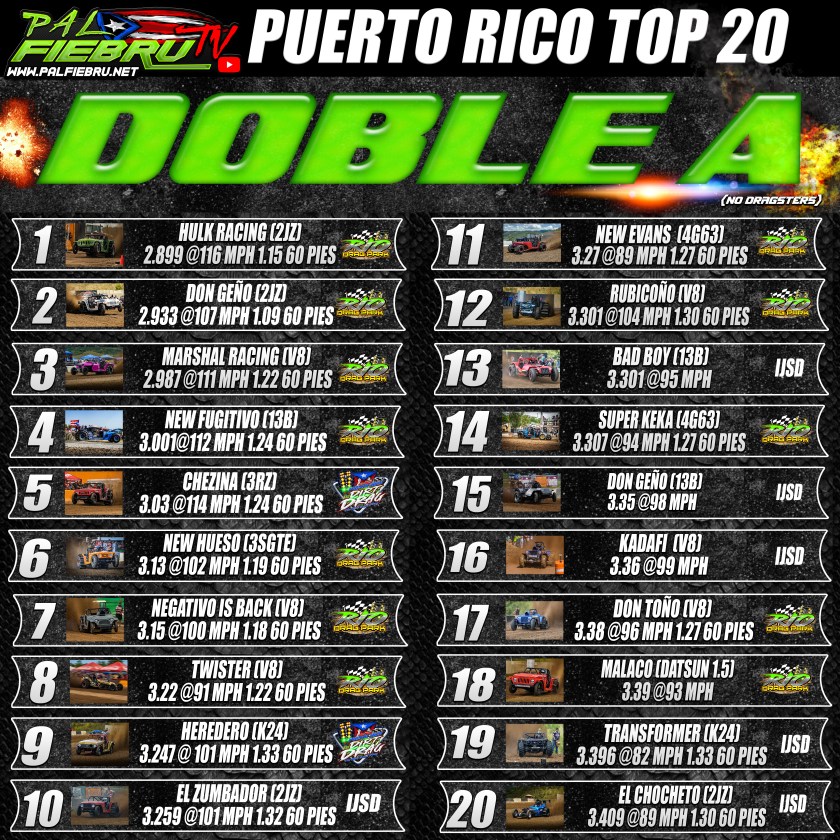 Luego de más de 2 años recopilando Data por fin tenemos el Top 20 de la Categoría Doble A en Puerto Rico. Tabla Exclusivamente para Chasis con un máximo aproximadamente de 125 pulgadas. Cual será el próximo en la tabla? Y Cual será el próximo en los 2 segundos?
